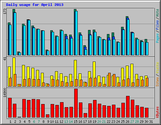| Day | Hits | Files | Pages | Visits | Sites | KBytes | ||||||